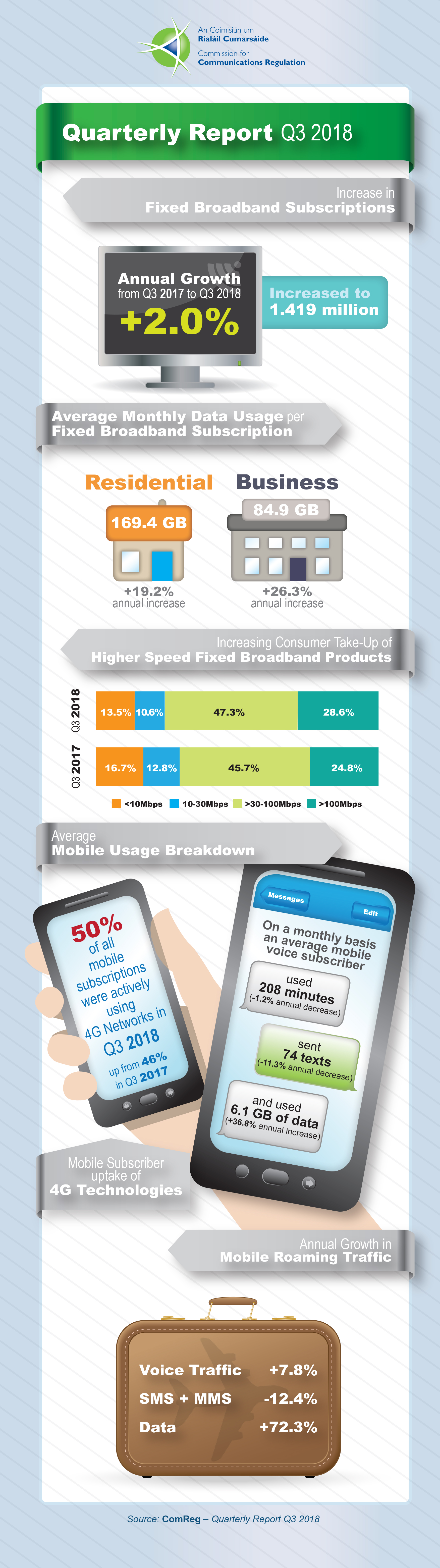 ComReg has today released its Quarterly Key Data Report on the Electronic Communications market for Q3 2018 (1 July to 30 September).