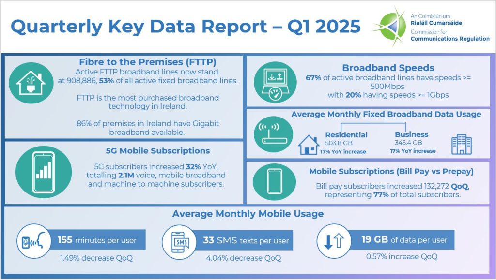 The Commission for Communications Regulation (ComReg) today released its Quarterly Key Data Report on the Electronic Communications market for the period 1 January to 31 March, Q1 2025.