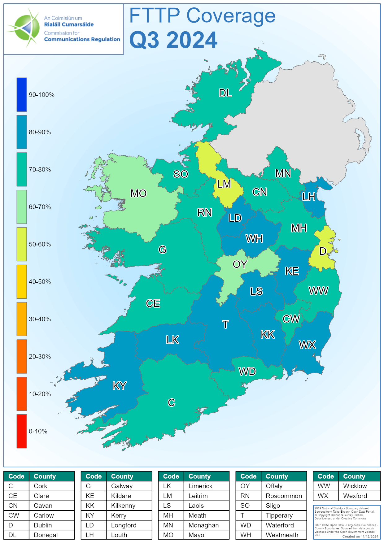 The County with the highest level of FTTP coverage is Laois at 89%, Dublin has the highest level of FTTP and/or Cable coverage at 92%. Leitrim has the fastest growing FTTP coverage within the last year, with a 29 percentage point increase in FTTP coverage compared to Q3 2023.