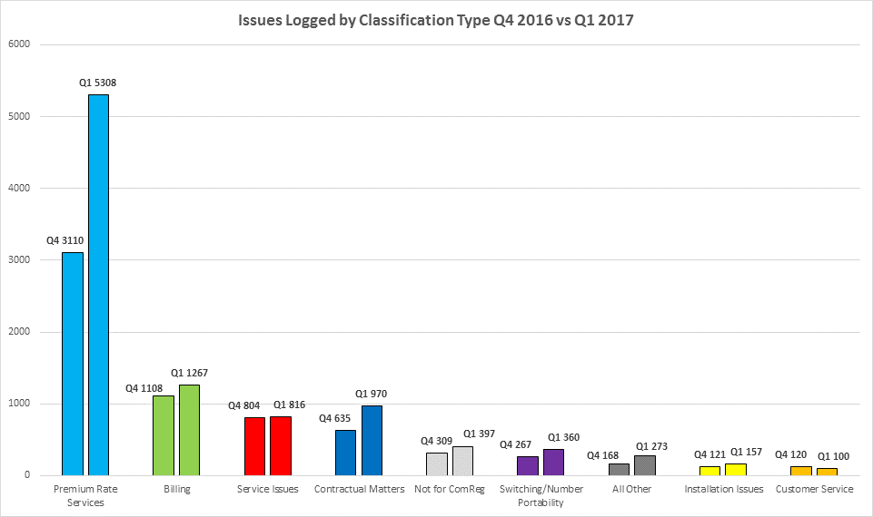 During this 3 month period, consumers contacted ComReg’s Consumer Line with 9,648 issues (both queries and complaints) about their fixed and mobile phones, premium rate and internet services.