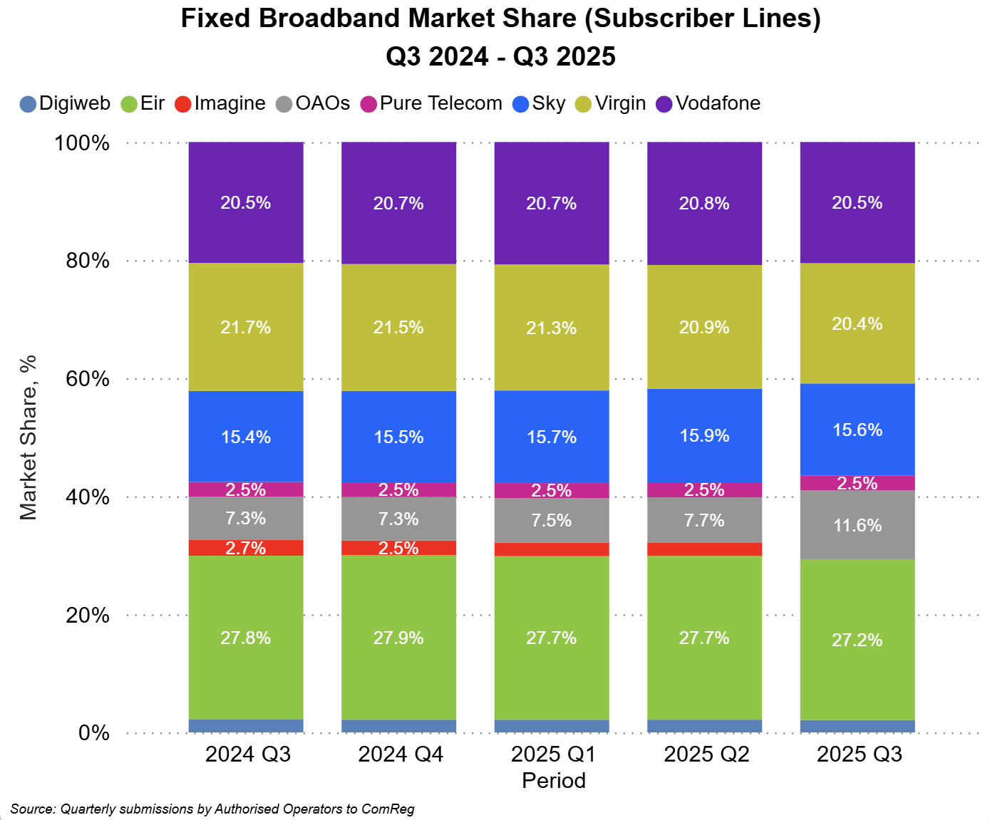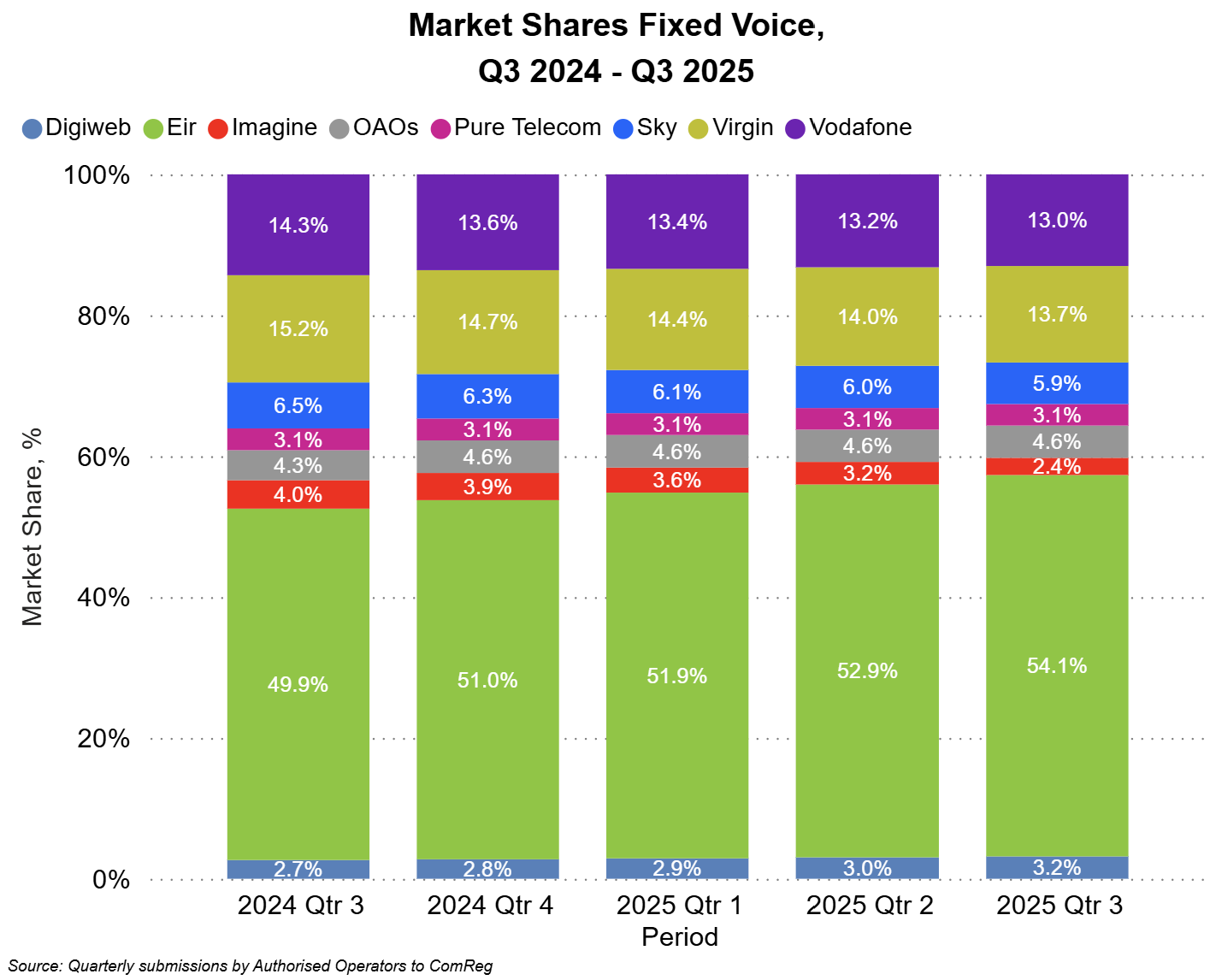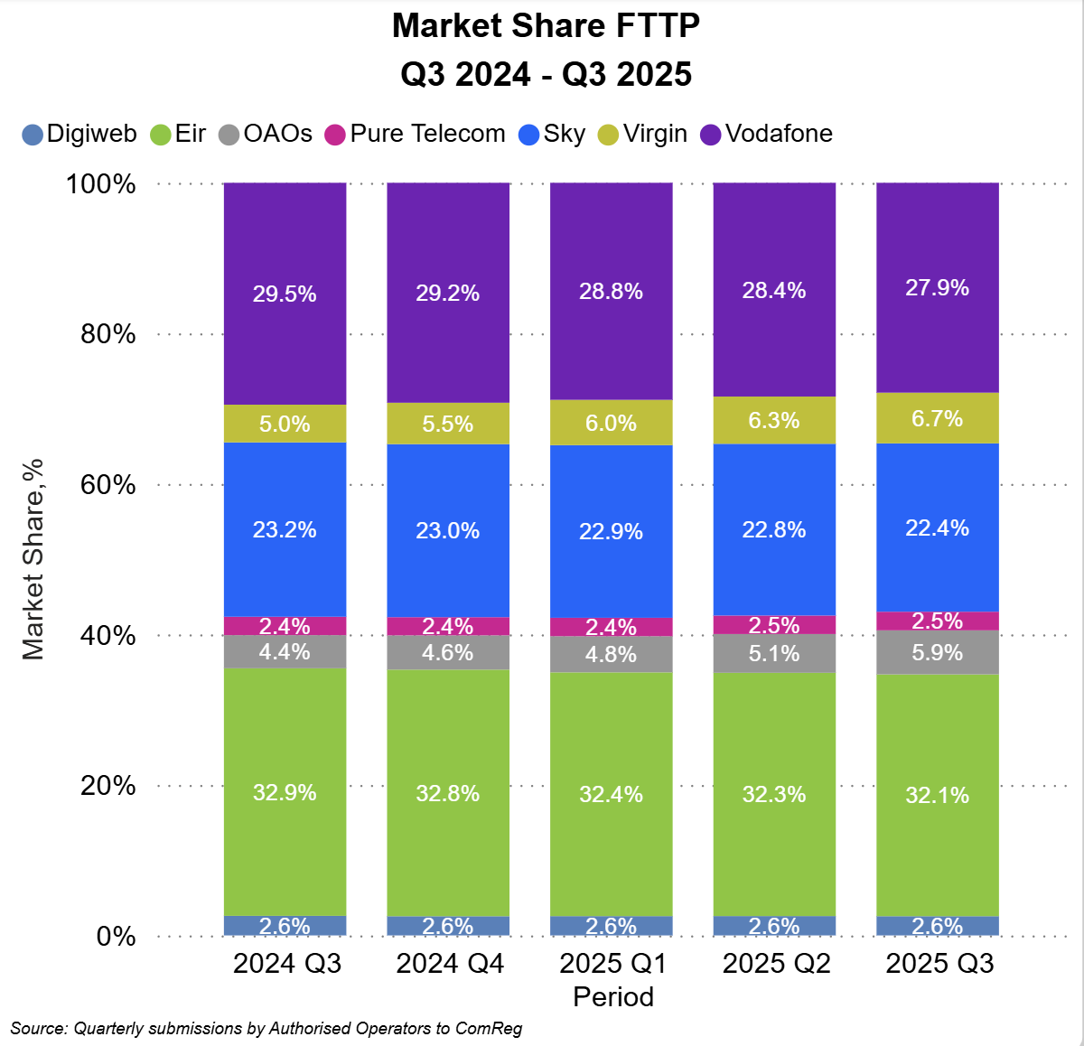 In Q3 2025 Vodafone had the highest market share excluding mobile broadband and M2M (32.5%), followed by Three (27.9%), Eir (24.4%), Tesco Mobile (8.2%), Lyca (2.8%), Virgin Mobile (2.4%), An Post Mobile (1.0%) and Sky Mobile (1.0%).