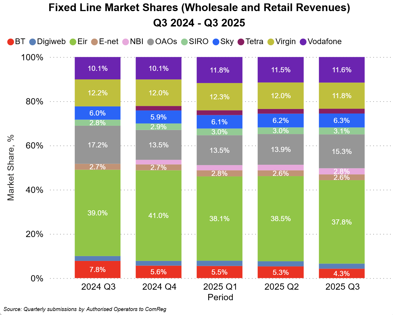 Figure 1 – Fixed Line Market Shares (Wholesale and Retail Revenue) Q3 2024 – Q3 2025