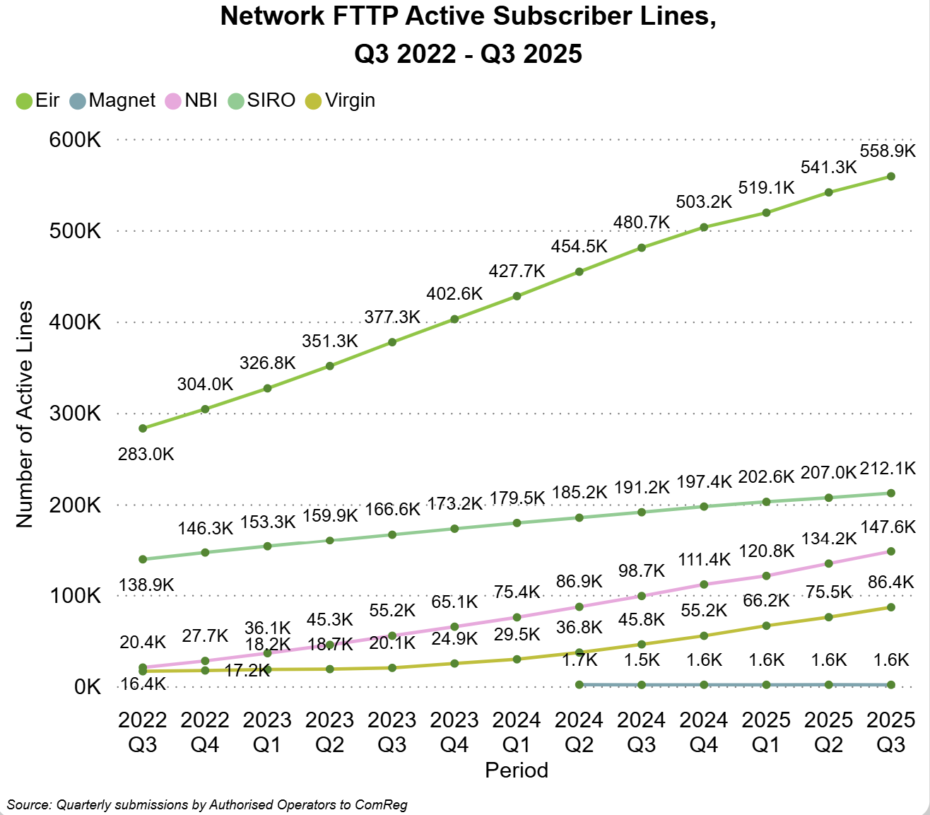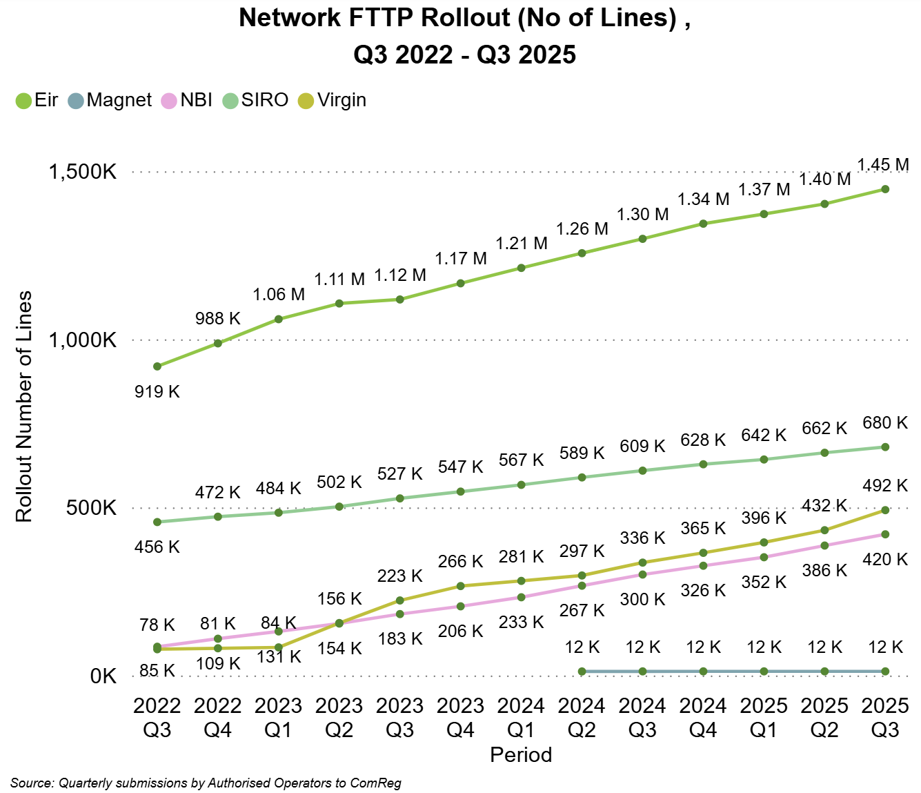 In Q3 2025, Eir reported having rolled out 1.45m (up 3% QoQ) FTTP broadband lines , followed by Siro with 680k (up 3% QoQ), Virgin Media Ireland with 492k (up 14% QoQ), NBI with 420k (up 9% QoQ), with Magnet having rolled out 12k lines and Crossan 63 lines.