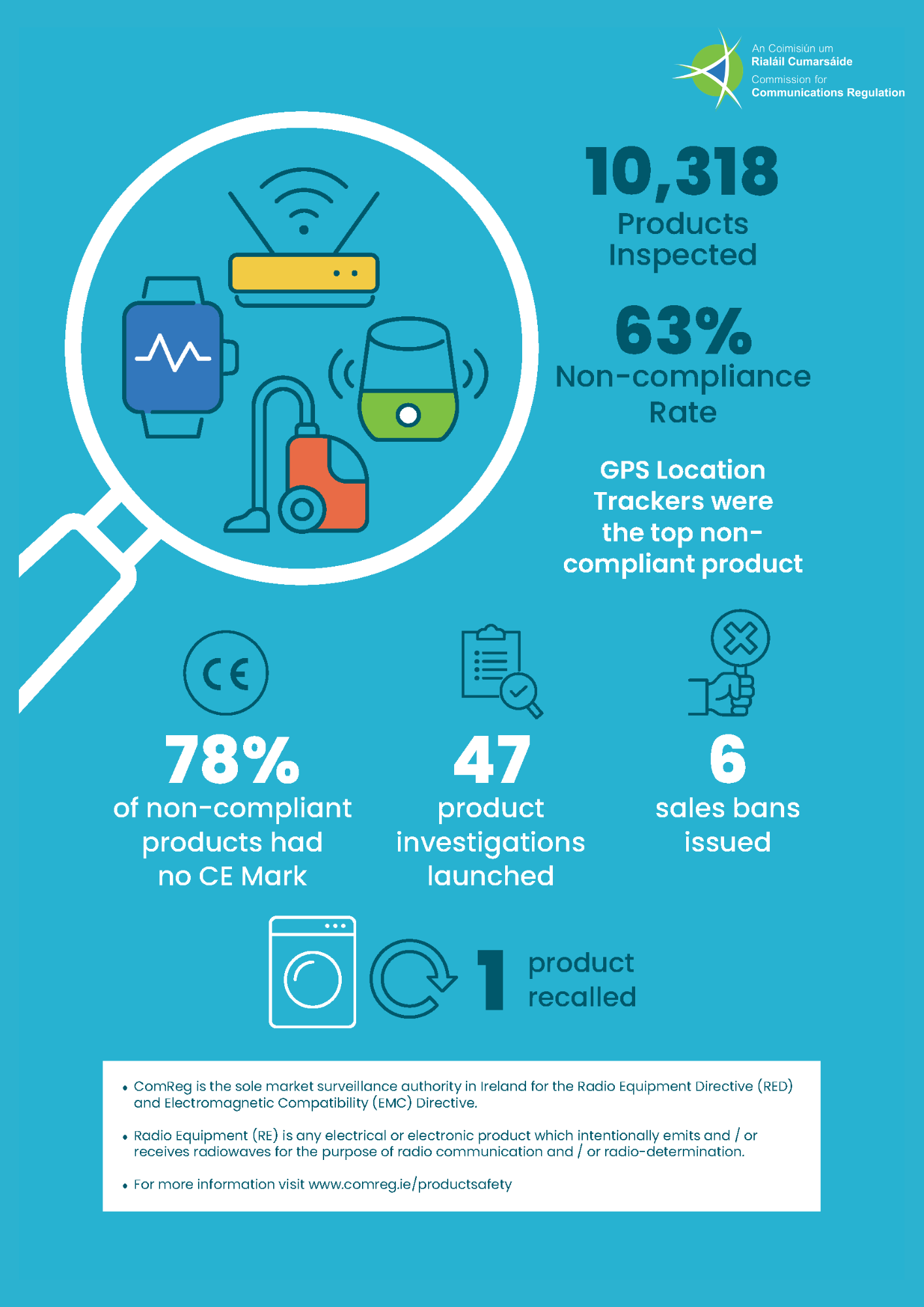 ComReg is the Market Surveillance Authority (MSA) in Ireland for the Radio Equipment Directive (RED) and the Electromagnetic Compatibility Directive (EMC). The functions and powers derived from these regulatory frameworks protect product end-users from unsafe products and protect businesses from unfair competition.