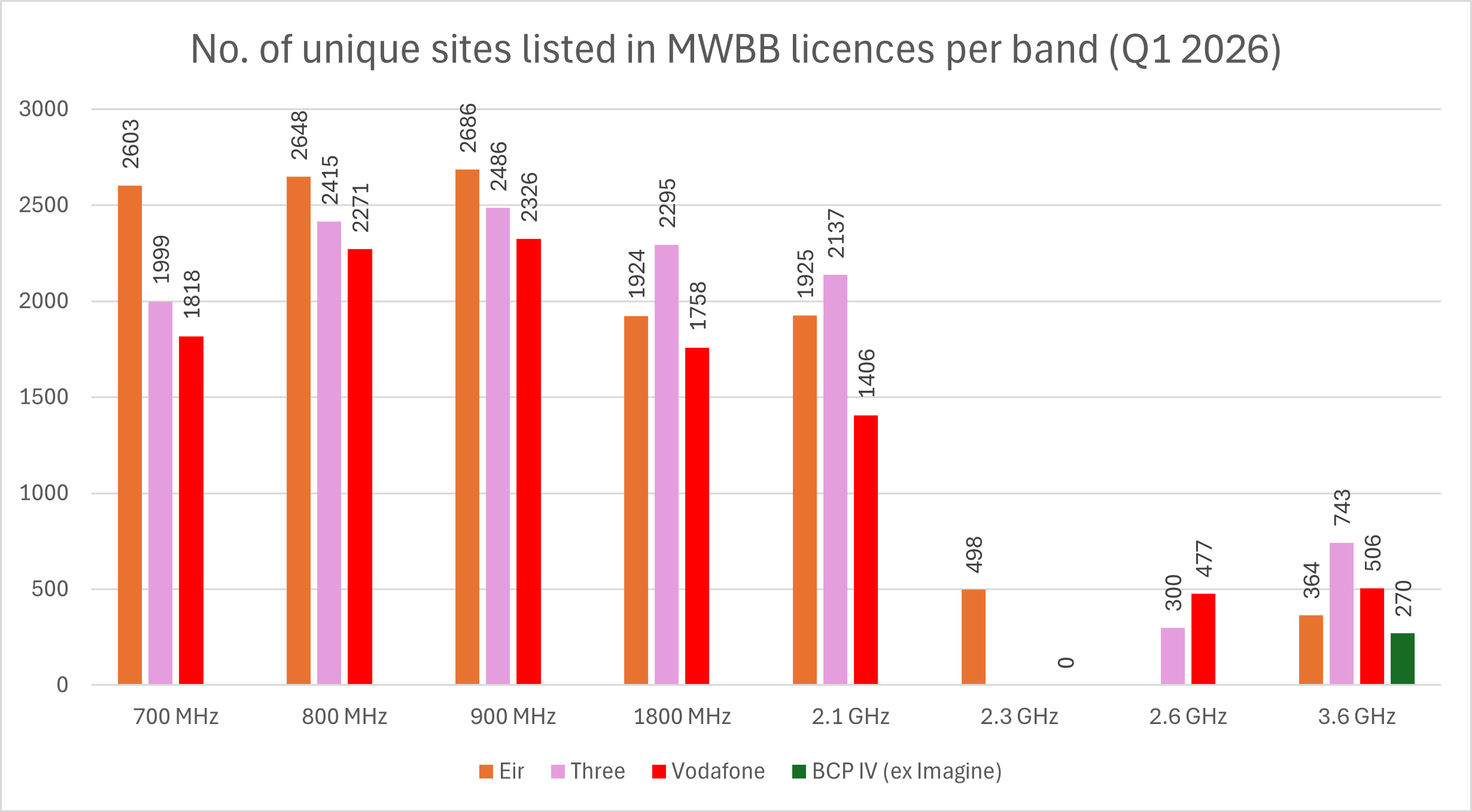 Based on the site information provided by the licensees in the schedules of the Mobile & WBB (MWBB) licences, the number of unique sites per licensee per band is set out in the table and Figure below.