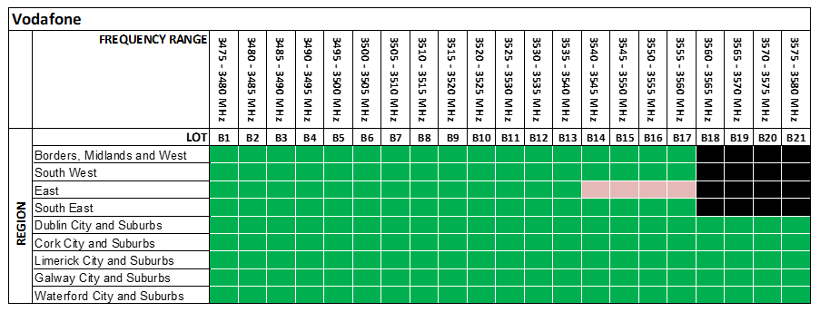 - Vodafone declined the commencement of Lots B1 to B5 in the Borders, Midlands and West Region under its 3.6 GHz Band Liberalised Use Licence.